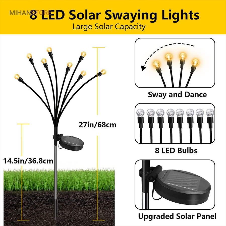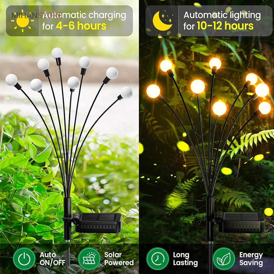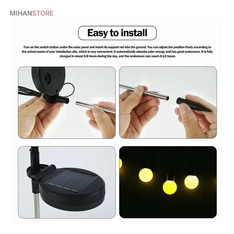چراغ خورشیدی باغچه مدل گل شب تاب با طراحی جدید محصولی جذاب و کاربردی و ضد آب است.این چراغ با دارا بودن 8 لامپ LED از جنس ABS و بهره گیری از پنل خورشیدی خود ، انرژی رایگان خورشیدی را در طول روز در باتری داخلی خود ذخیره کرده و پس از غروب آفتاب با فرمان سنسور فتوسل موجود در پنل خورشیدی فعال میشود. محصول را میتوانید در هرجایی با نور مستقیم خورشید مثل حیاط ، باغ ، ویلا و بالکن نصب یا قرار داد و در طول شب از نور آن بهره برد. پشت پنل دکمه ON/OFF قرار دارد که با قرار دادن در حالت ON روشن و OFF خاموش میشود. شاخه های چراغ باغی شب تاب به هنگام وزش باد در تاریکی شب تکان میخورند، و با نور درخشان و زیبا، خانه و باغ شما را هر شب ستاره دار میکند و جلوه ای خاص به فضای باغ و ویلای شما میبخشد.