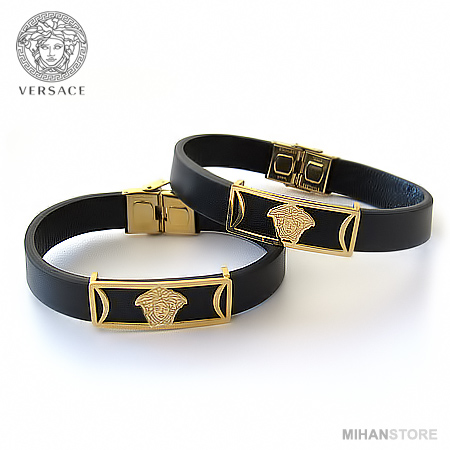دستبند چرمی طرح ورساچه با دو رنگ قهوه‌ای و مشکی و پلاک نازک طلایی ورساچه  نمونه‌ای از زیورهای ساده و در عین حال پرطرفدار از جانب آقایان و خانوم ها است که با اکثر رنگ‌های لباس همخوانی داشته و در عین حال متفاوت دیده می‌شود. این دستبندها مناسب ترین هدیه برای جوانان شیک پوش است.